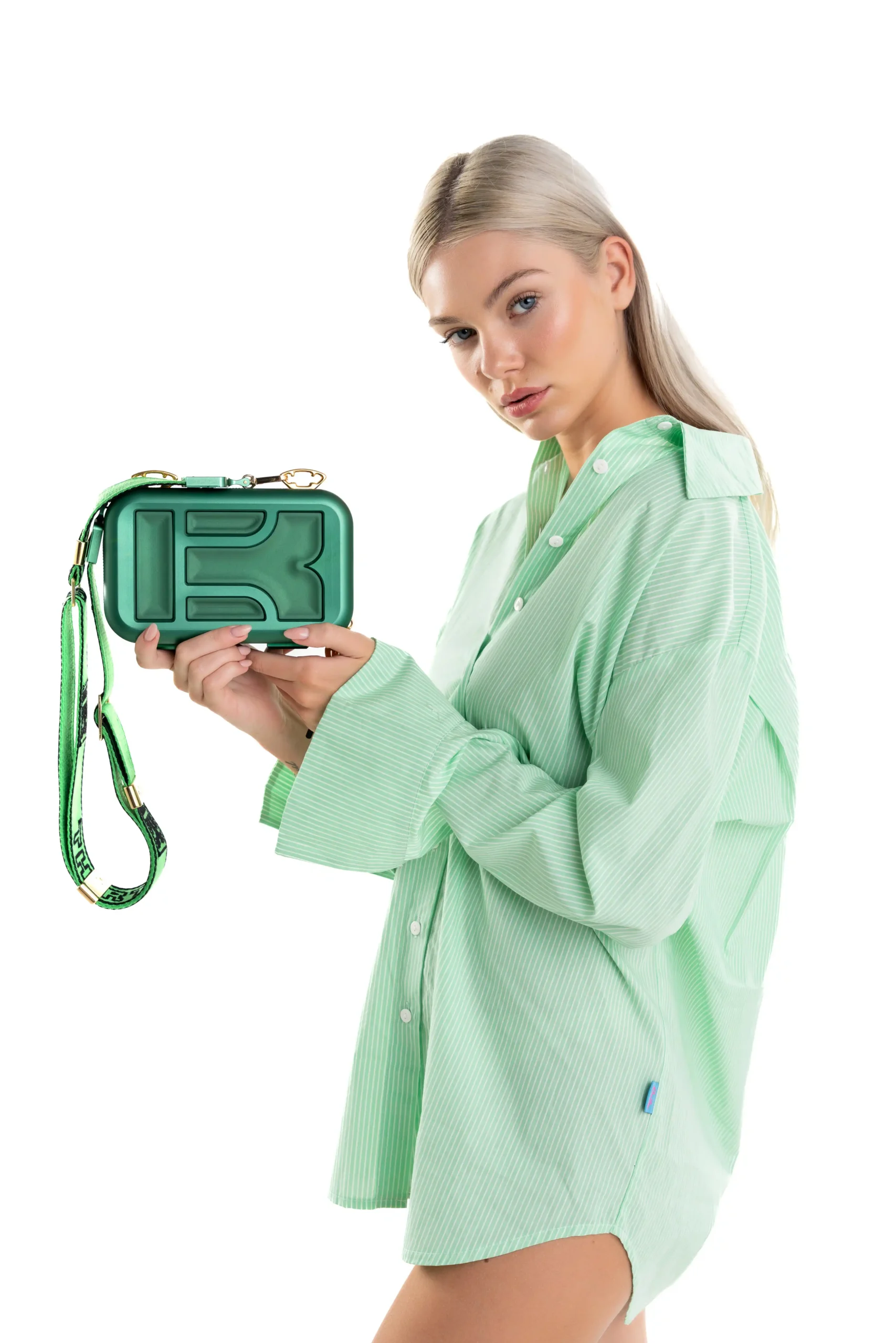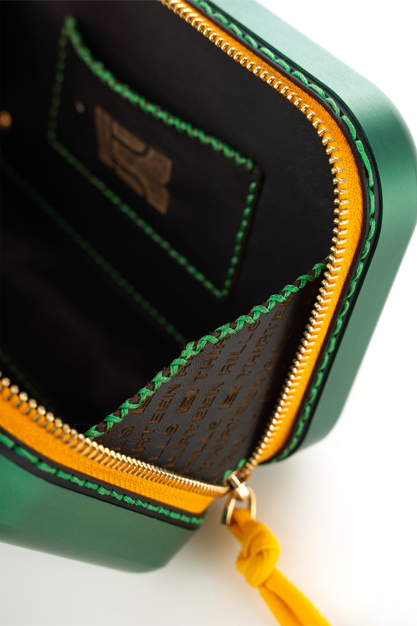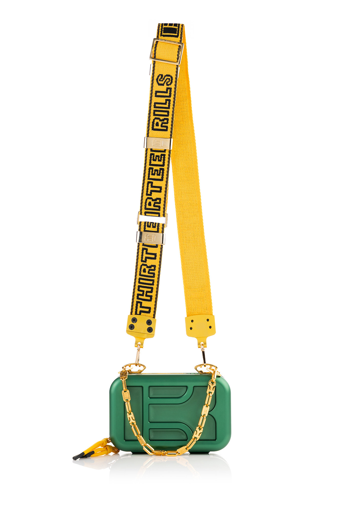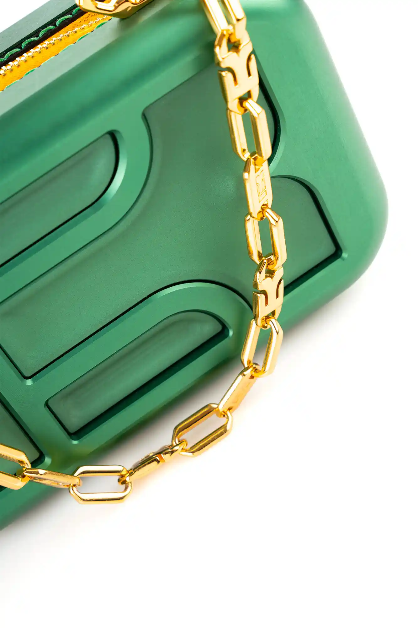 Aluminum, Calfskin Leather, Gold Details, green Zipper with Gold Details