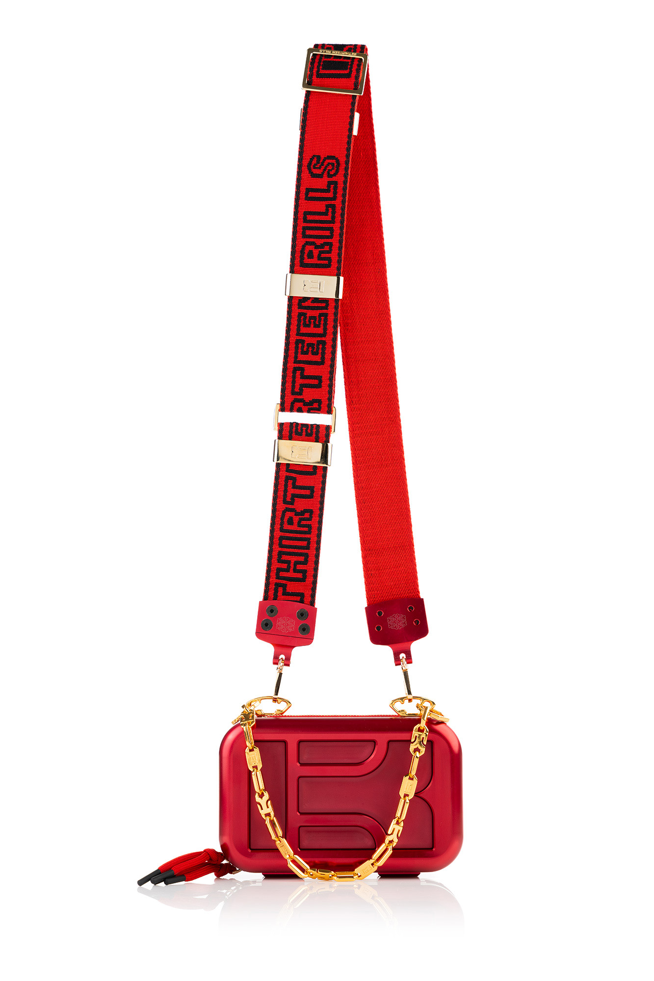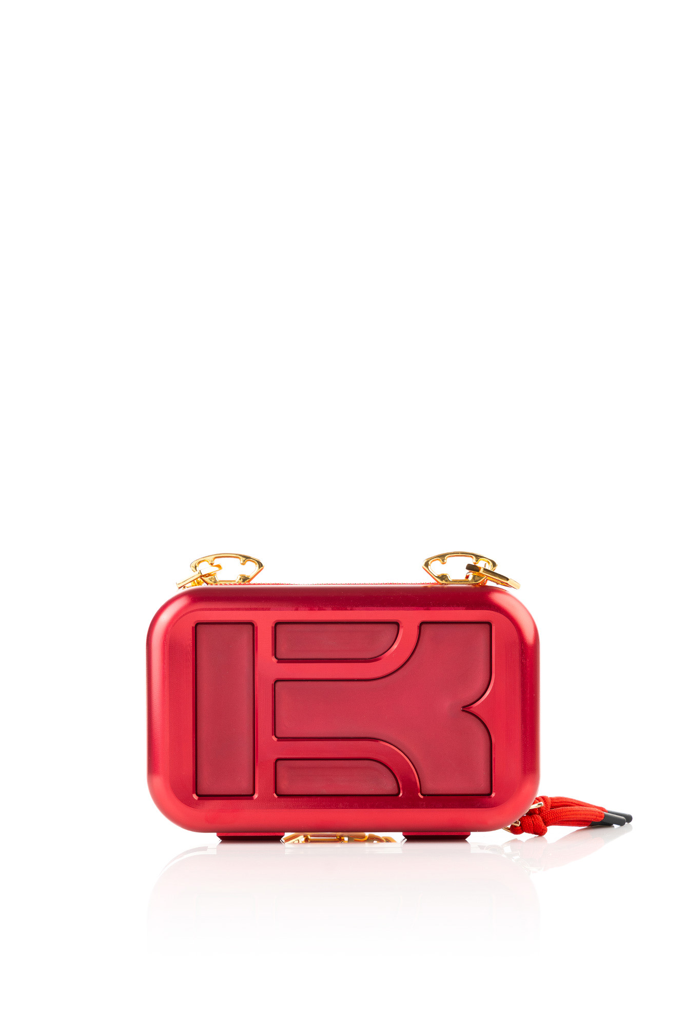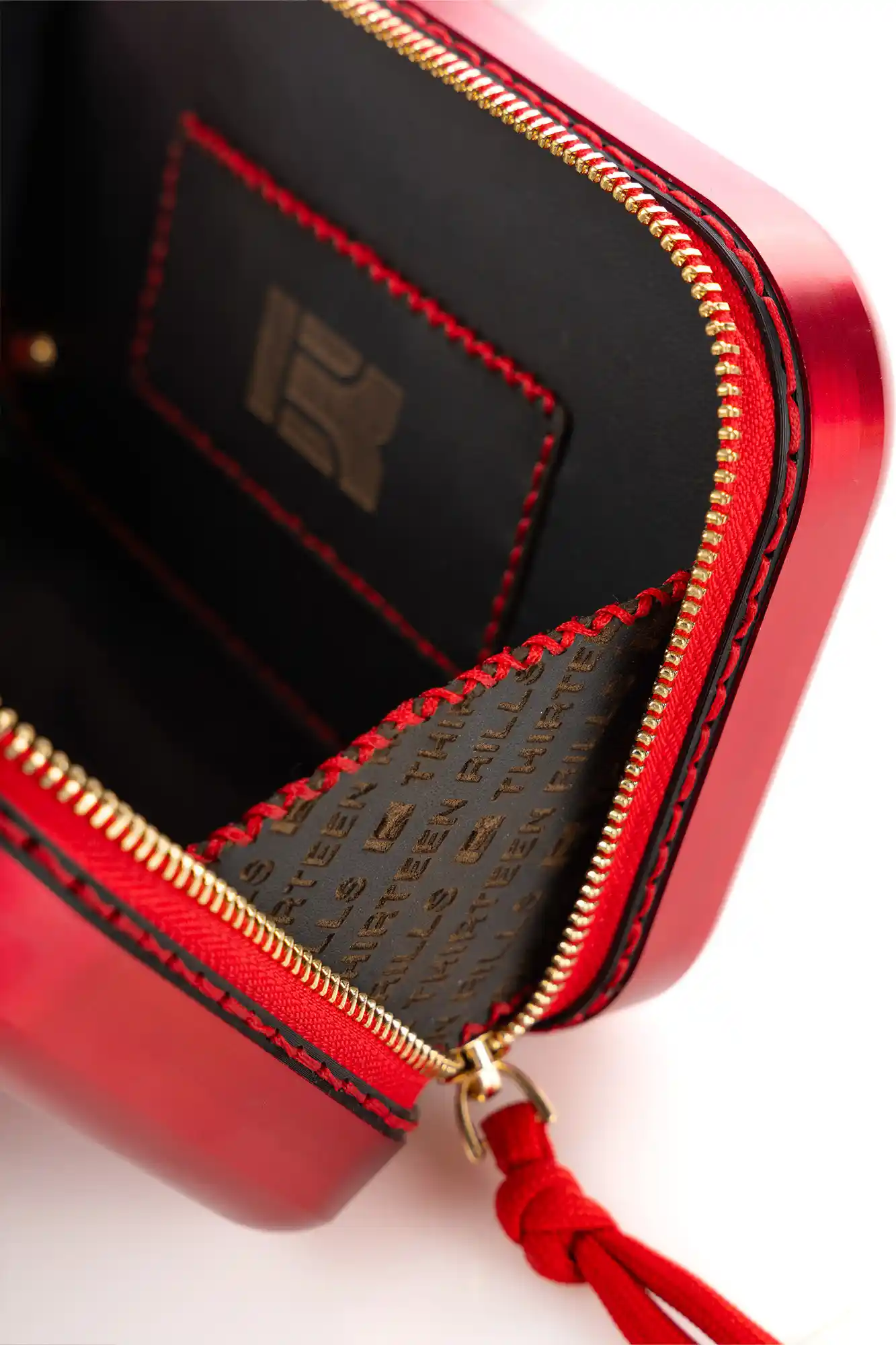 Aluminum, Calfskin Leather, Gold Details, Red Zipper with Gold Details