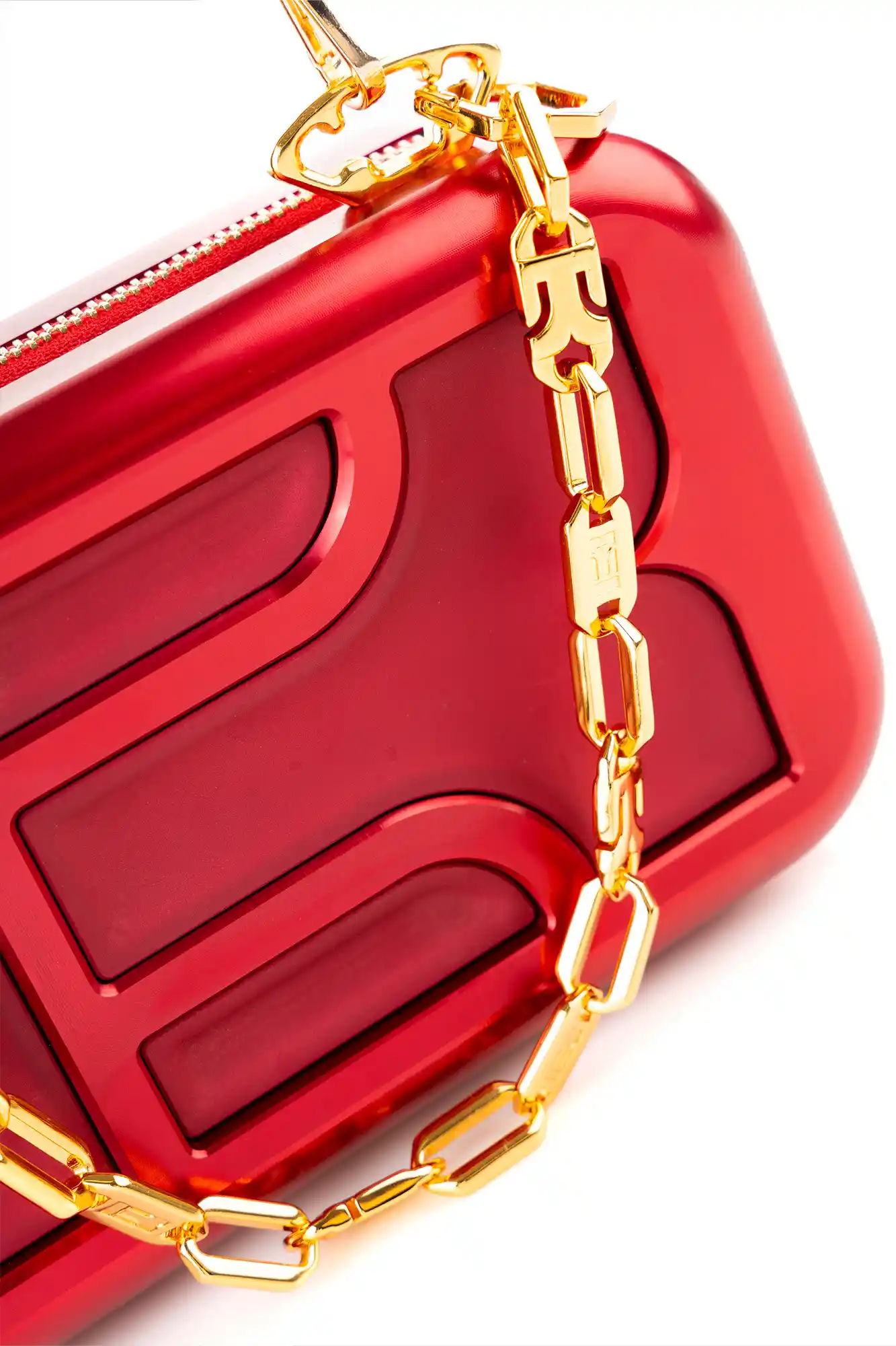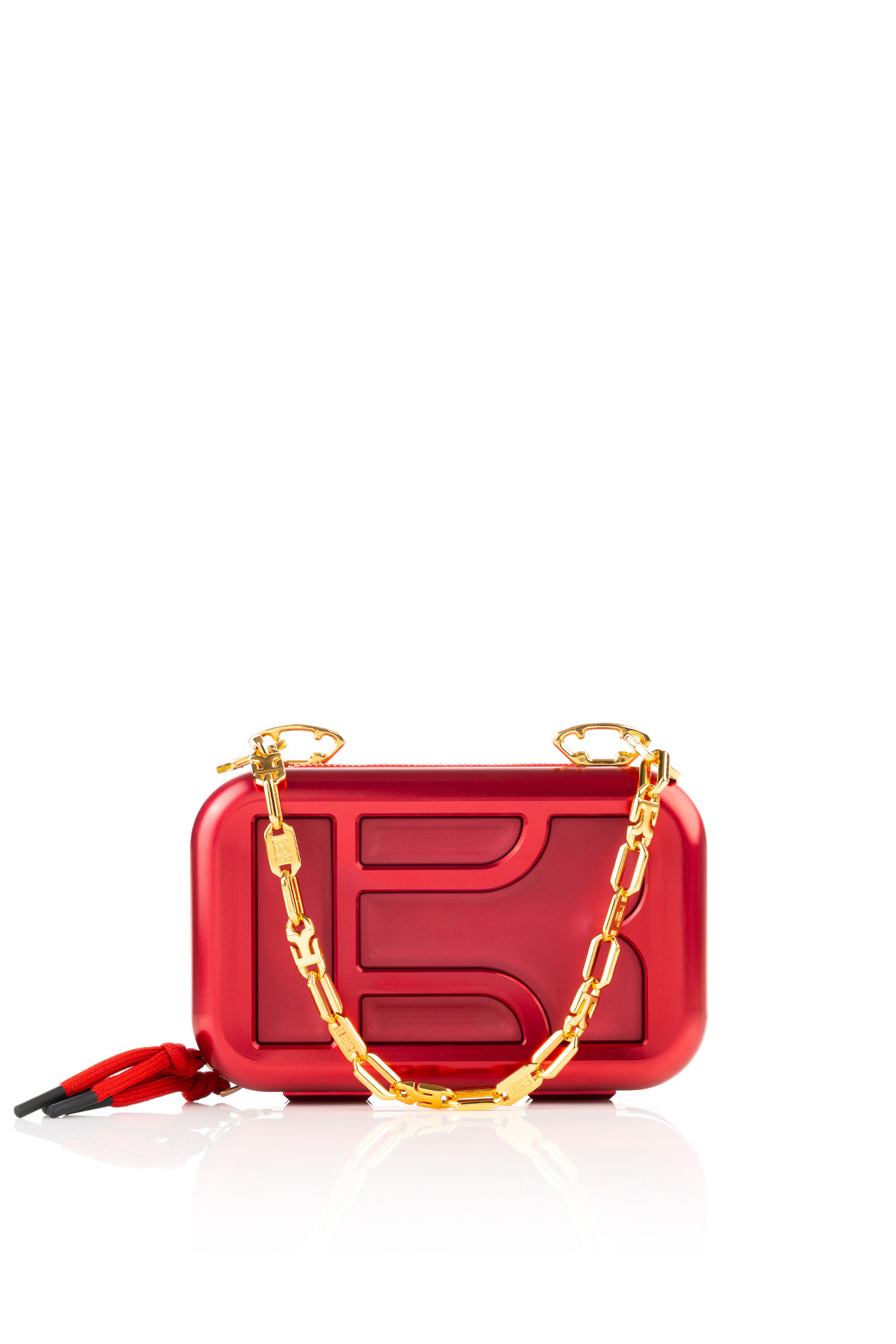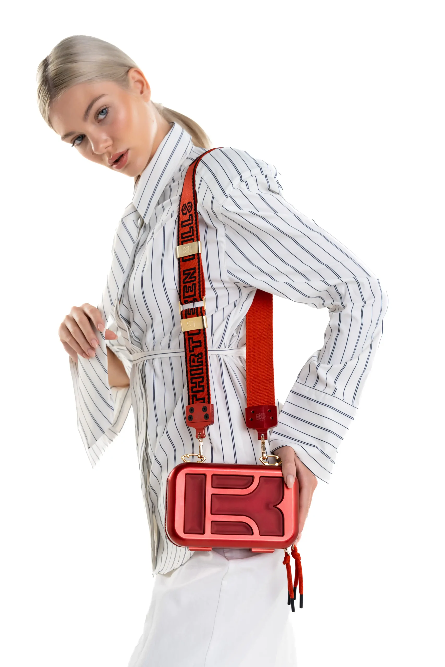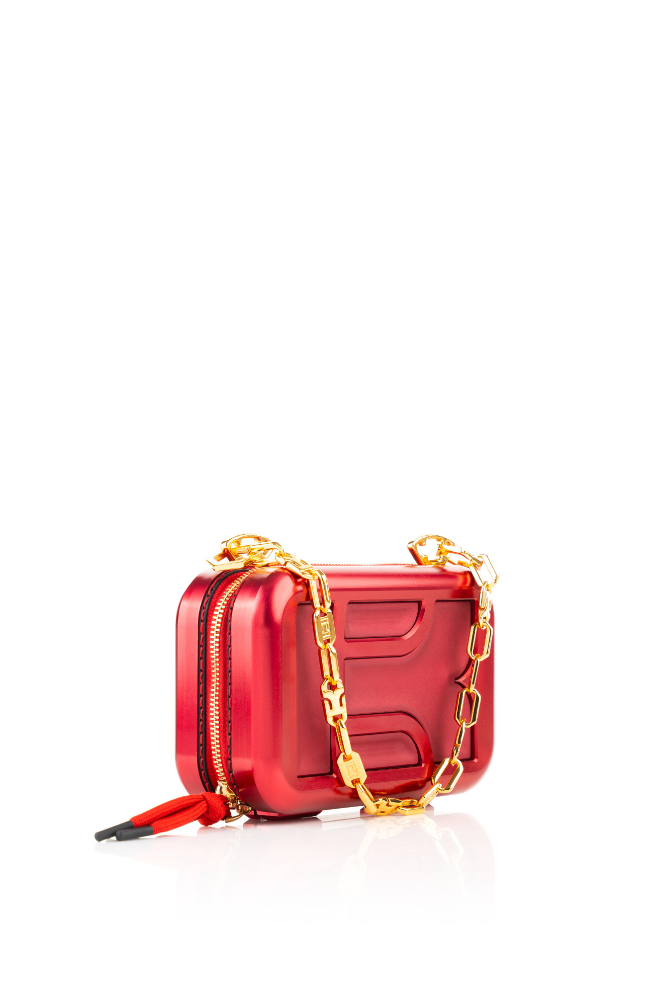 Aluminum, Calfskin Leather, Gold Details, Red Zipper with Gold Details