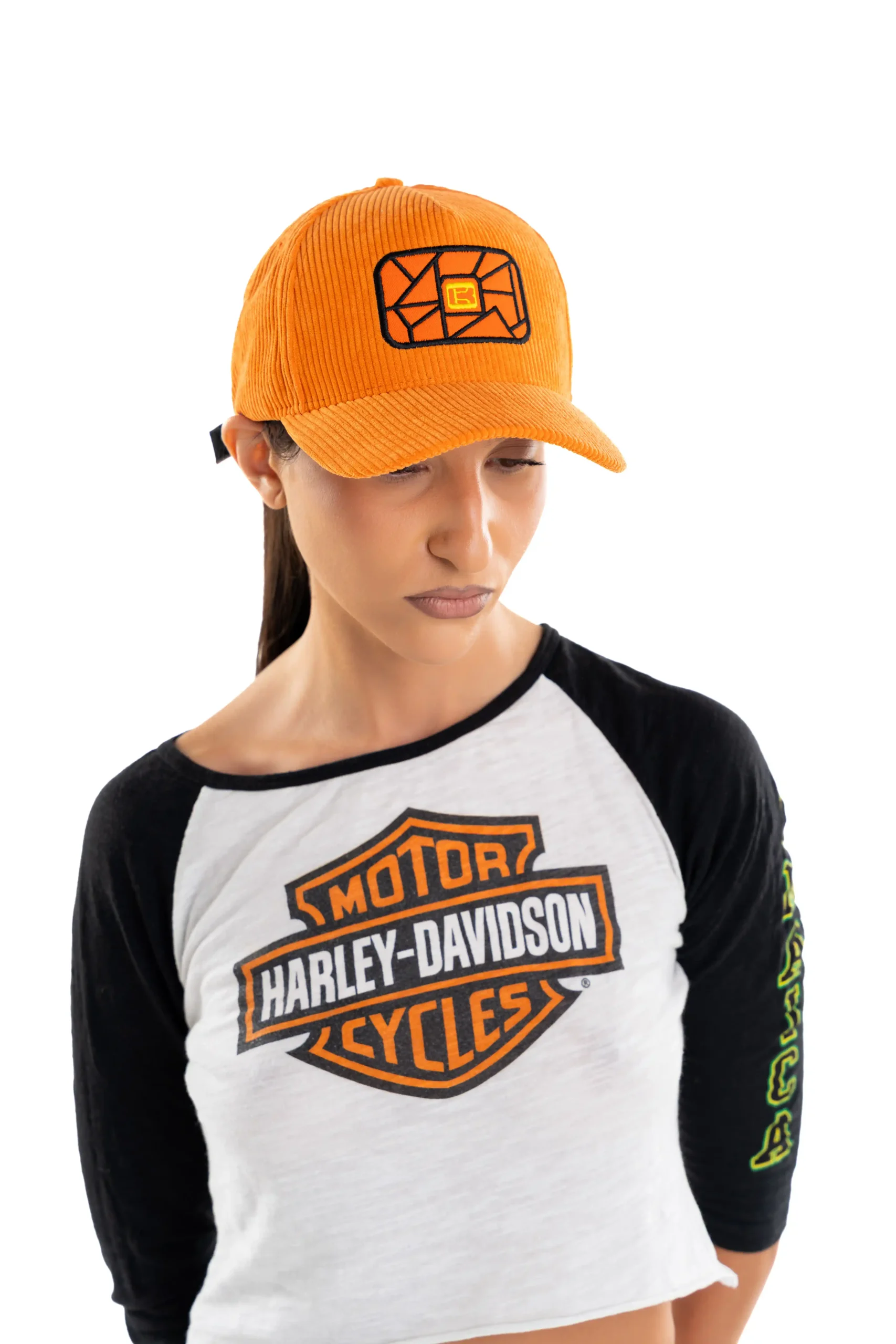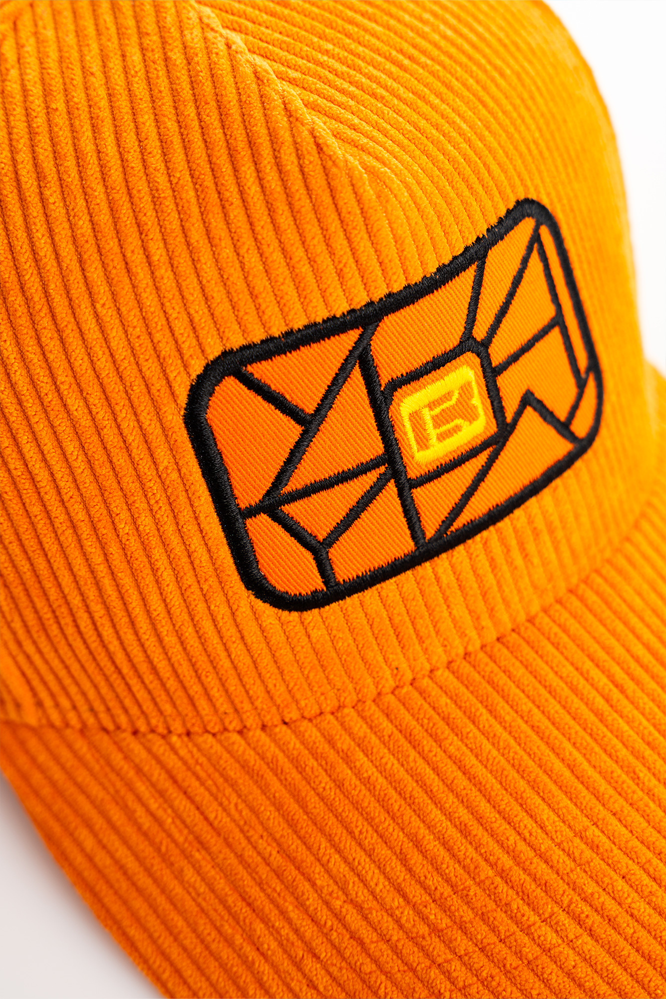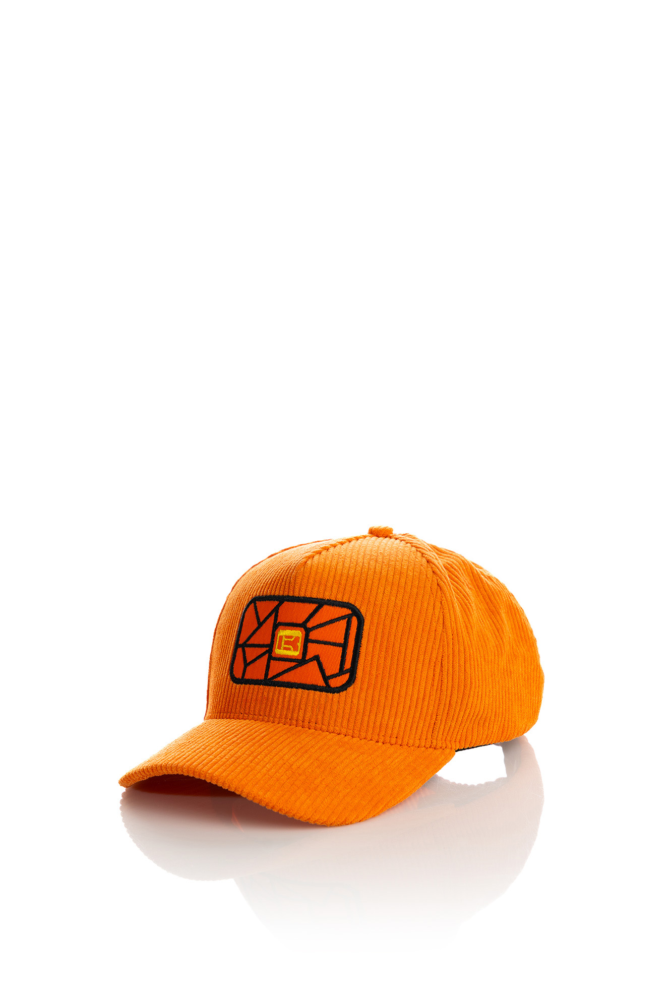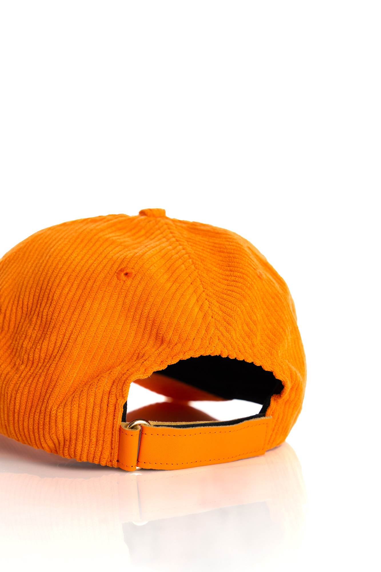 Bold orange corduroy baseball cap, bringing a distinctive luxury touch.