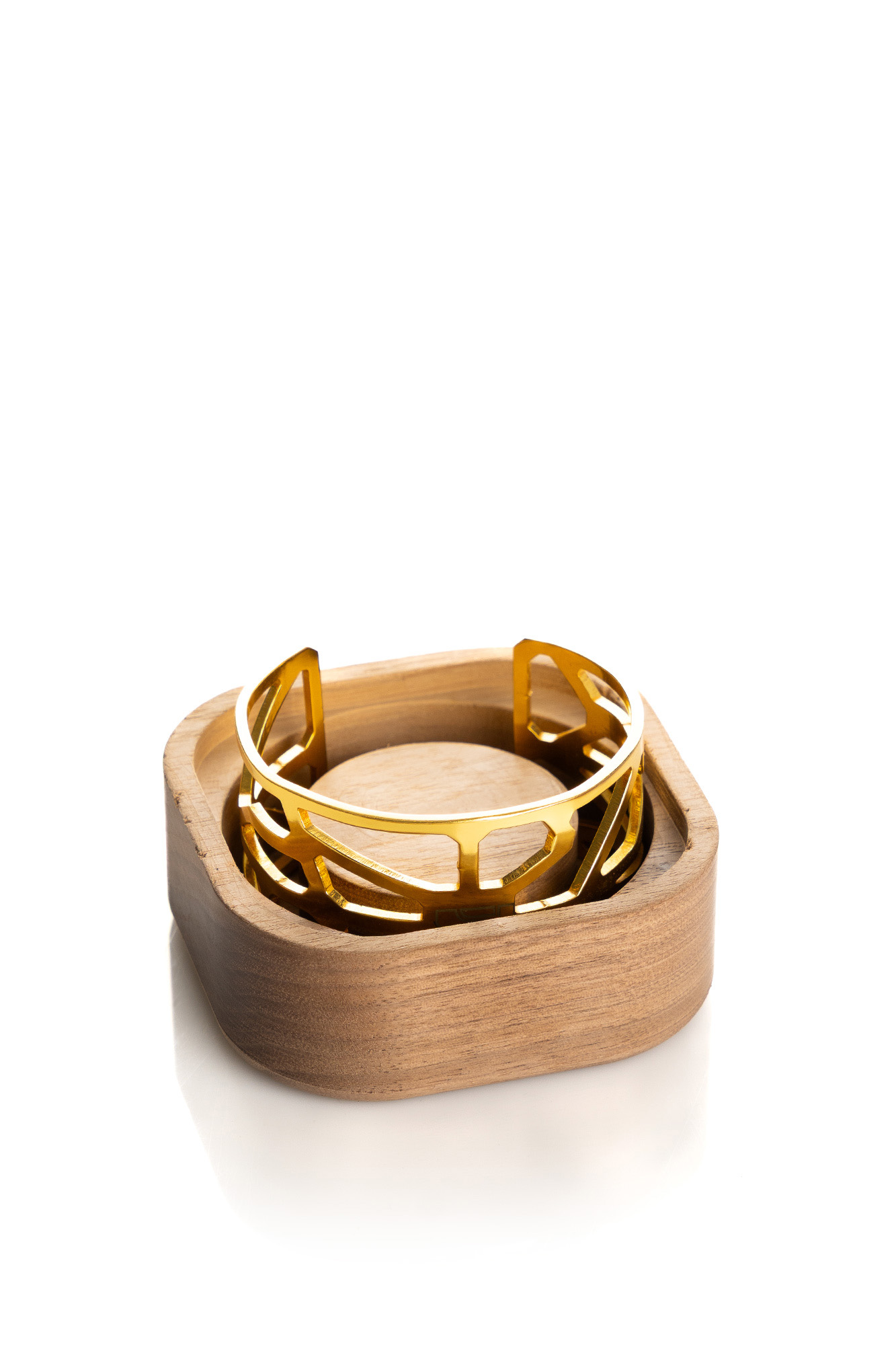 Packaging: Wooden box with glass logo and custom interior for cuff