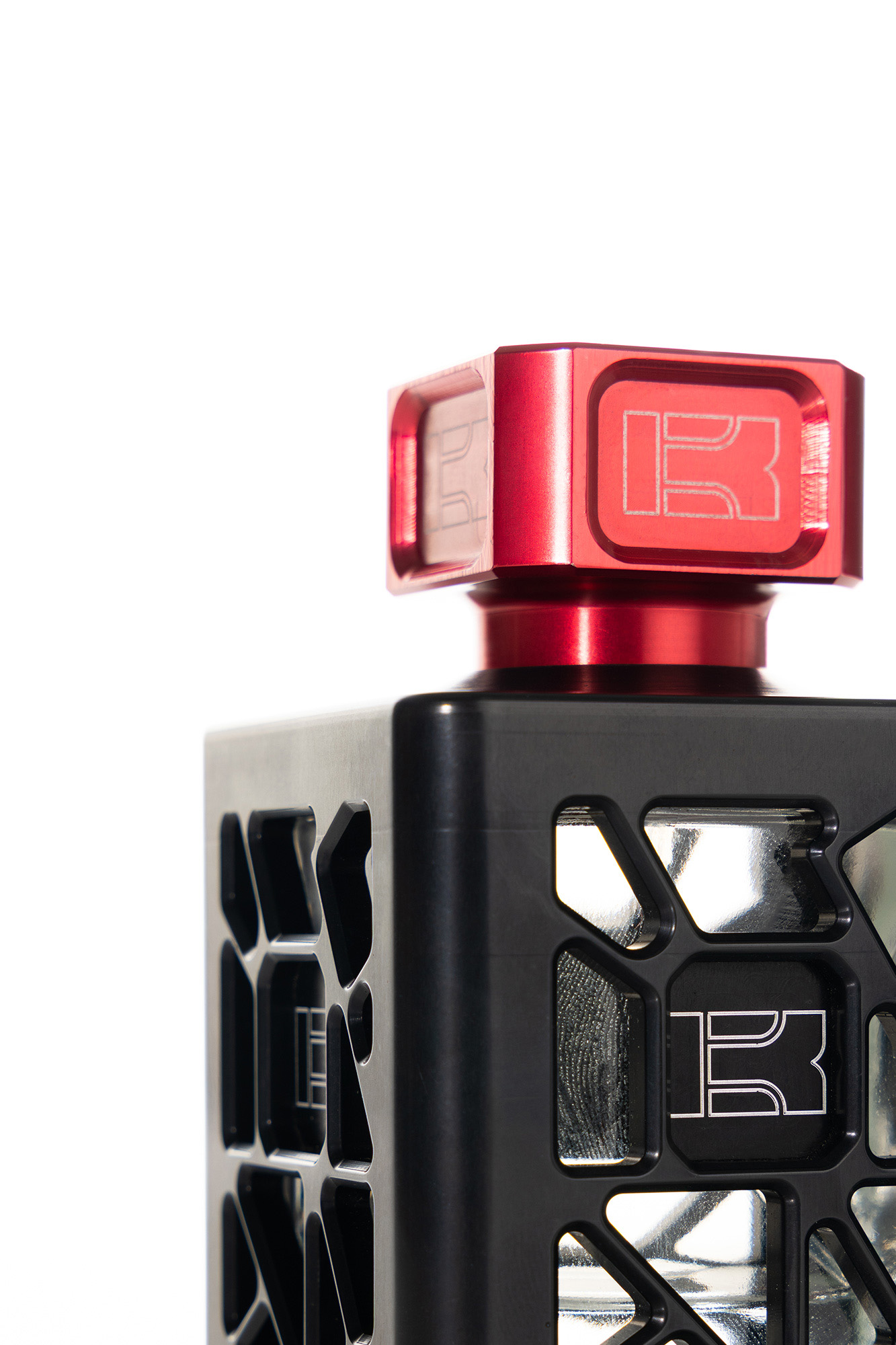 Bottle: 100 ml glass bottle, encased in a fixed aluminum cover with red cap