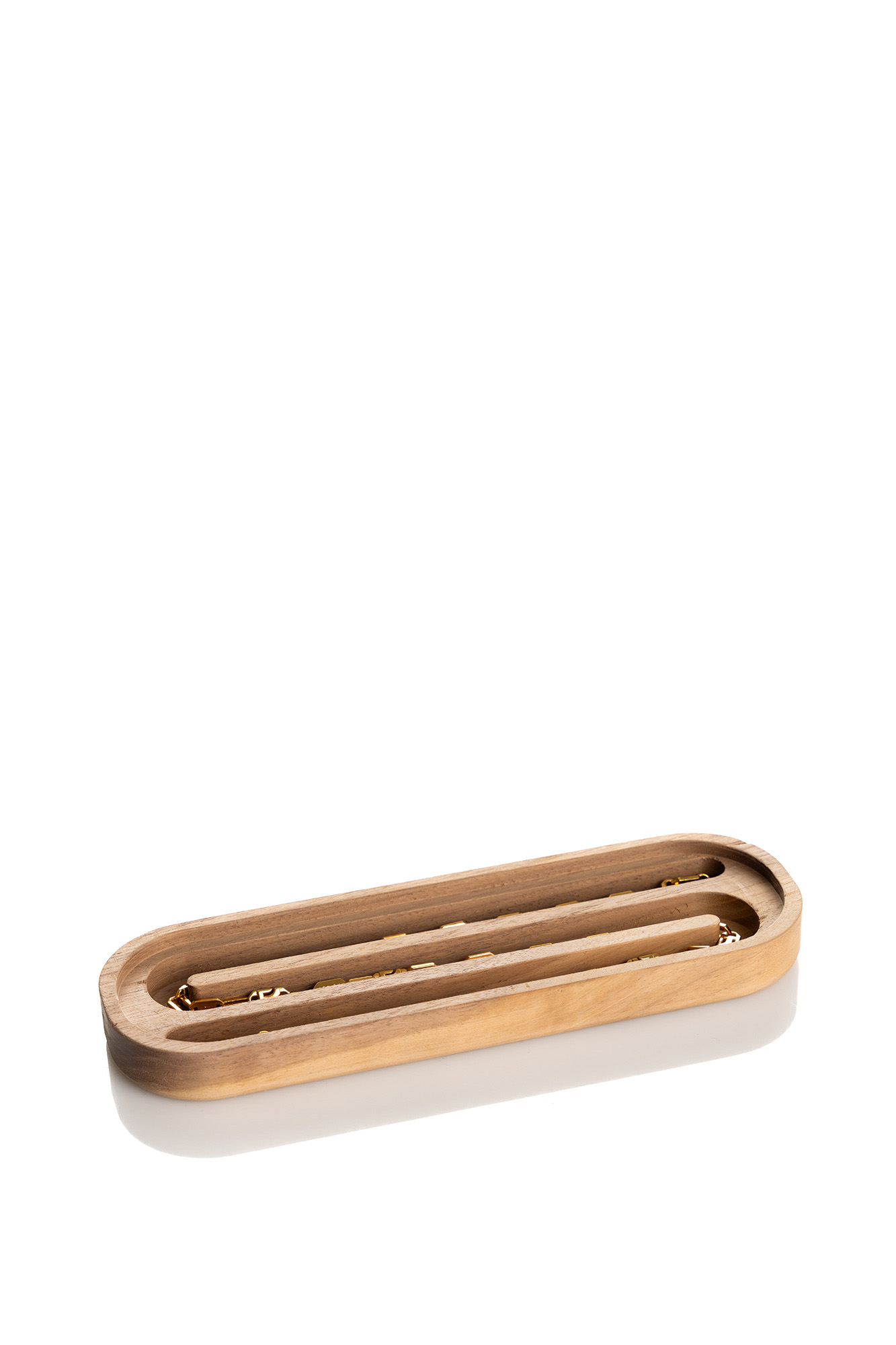 Packaging: Handcrafted wooden box with glass logo and custom interior for chains