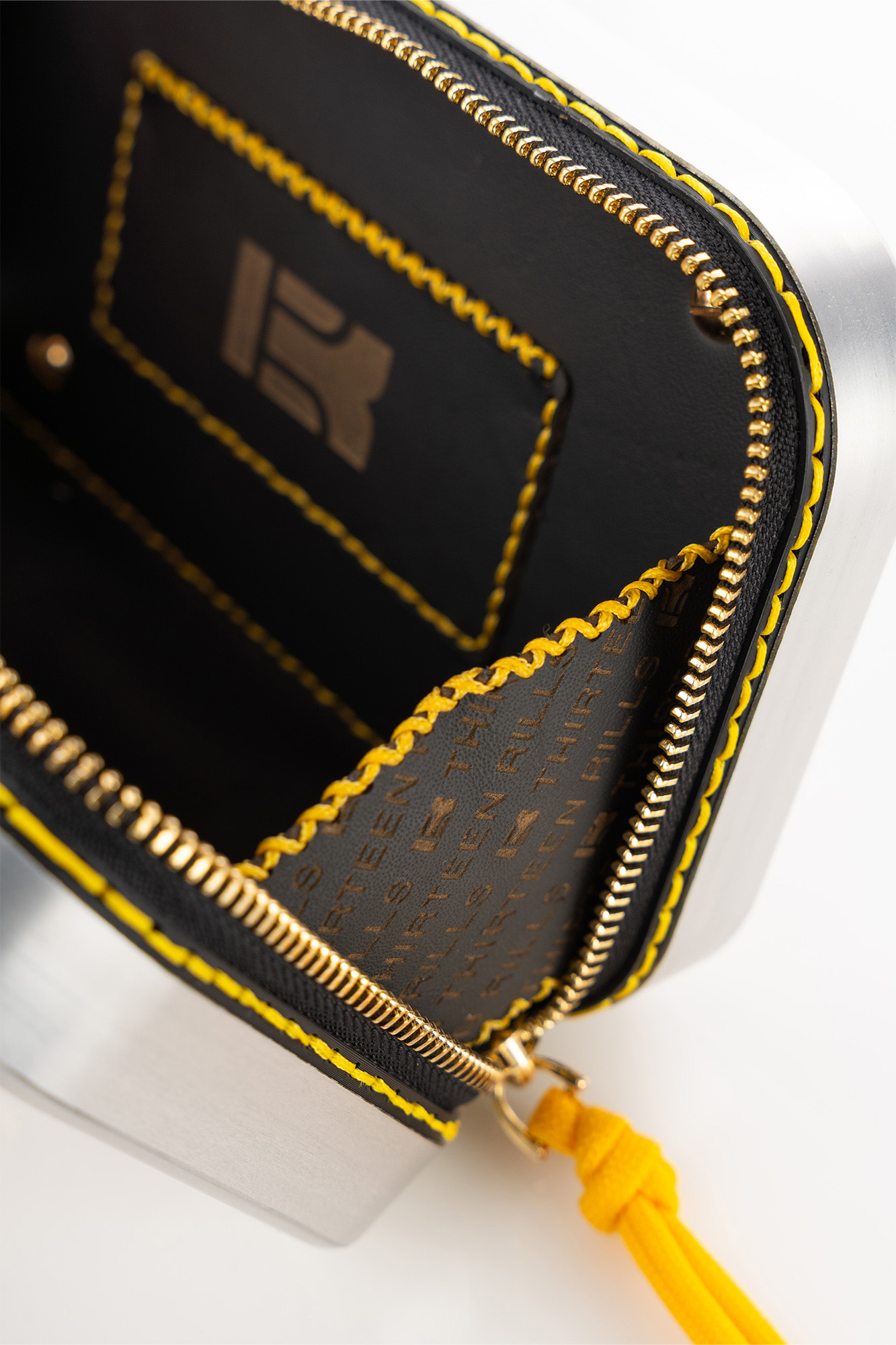 Aluminum, Calfskin Leather, Gold Details, Black Zipper with Gold Details
