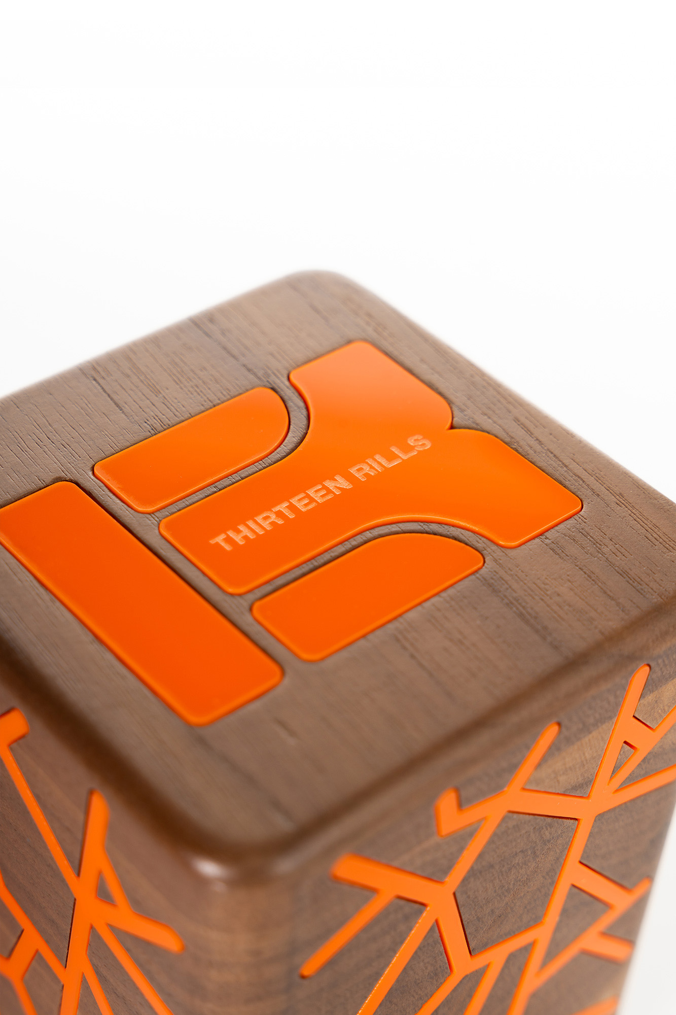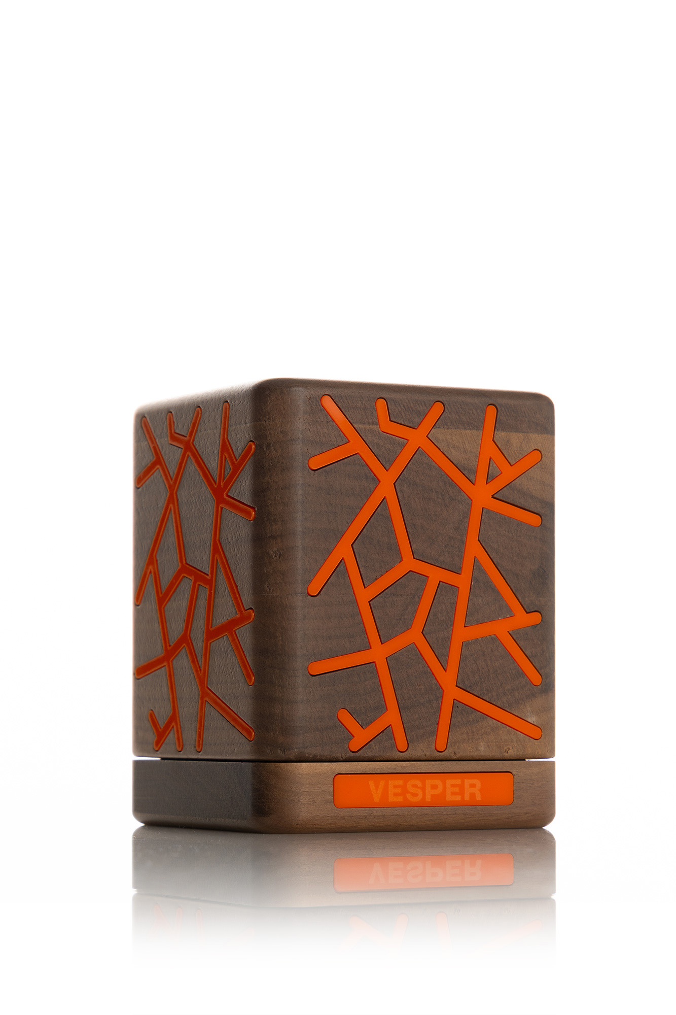 Packaging: Wooden box with orange accents