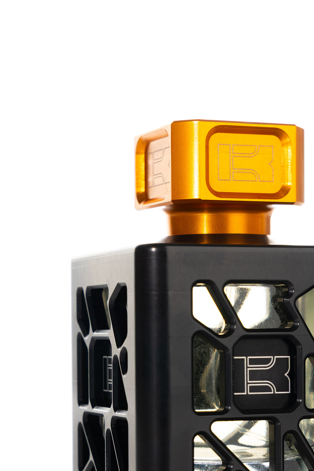 Bottle: 100 ml glass bottle, encased in a fixed aluminum cover with orange cap