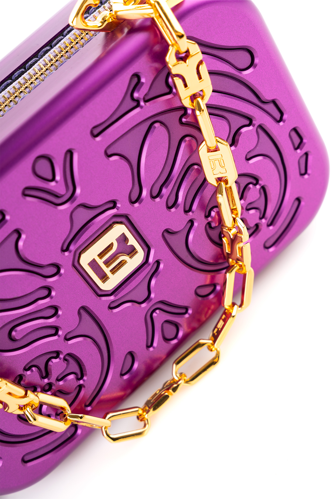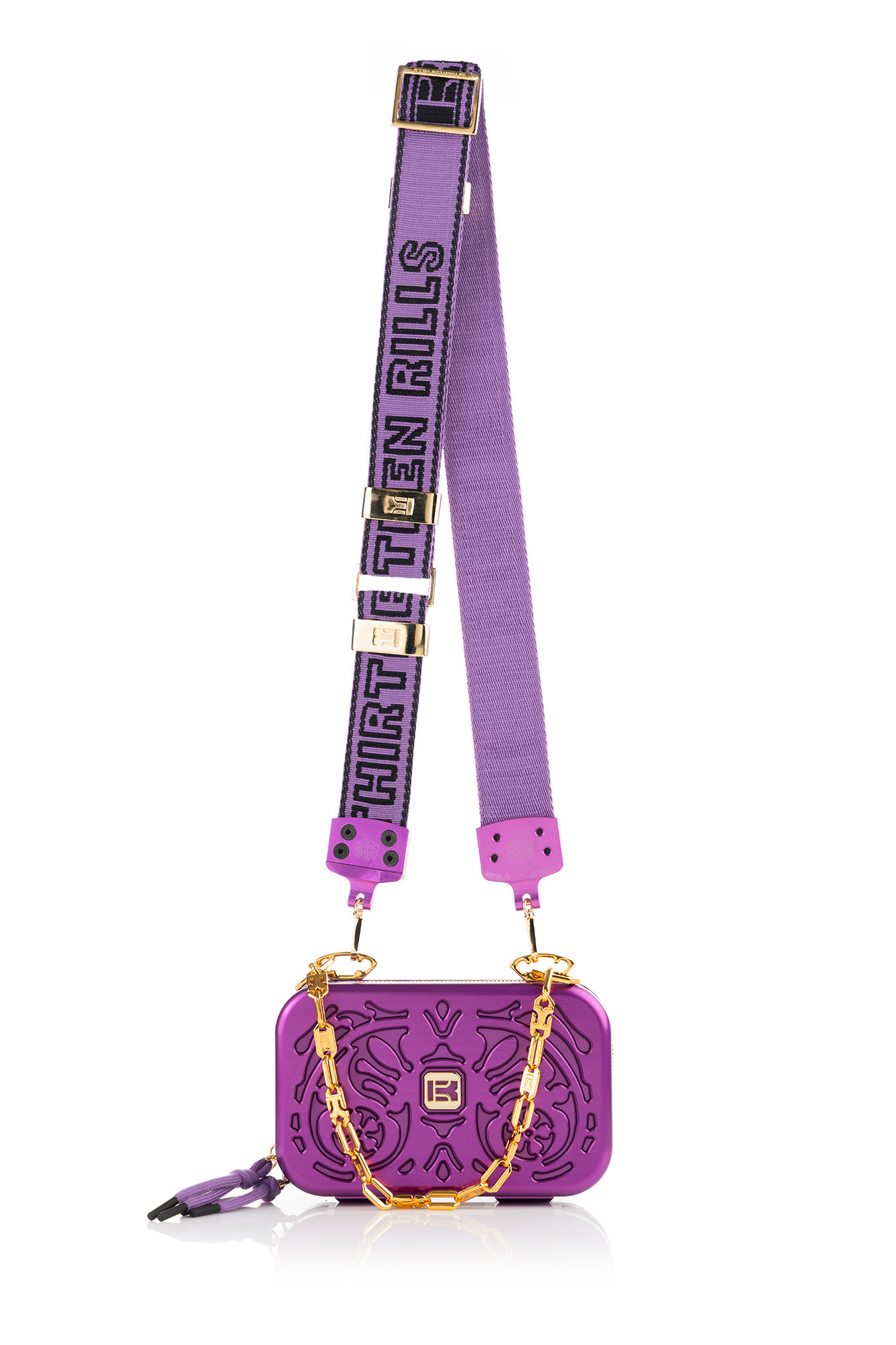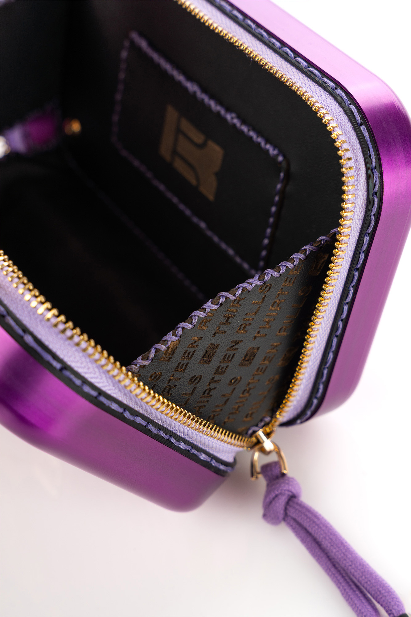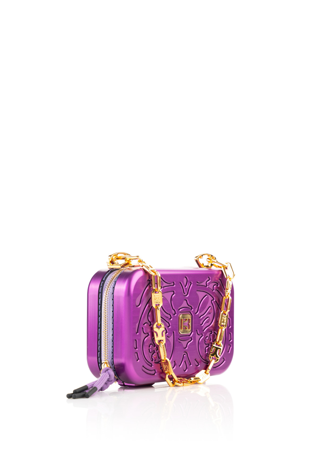 Aluminum, Calfskin Leather, Gold Details, Purple Zipper with Gold Details